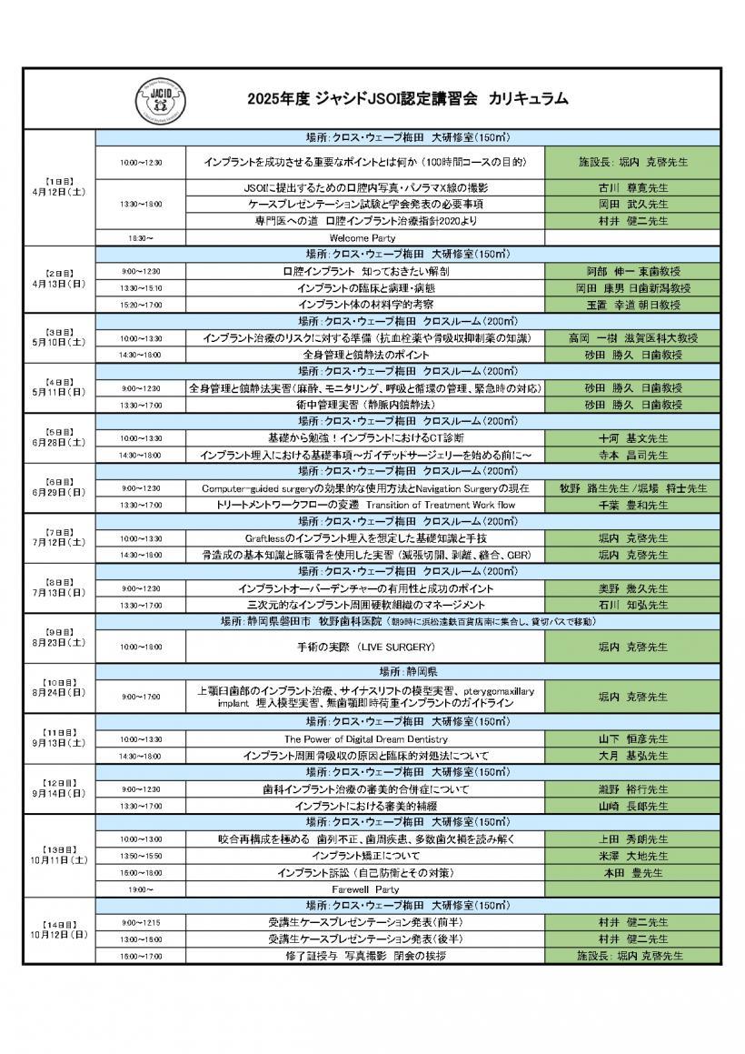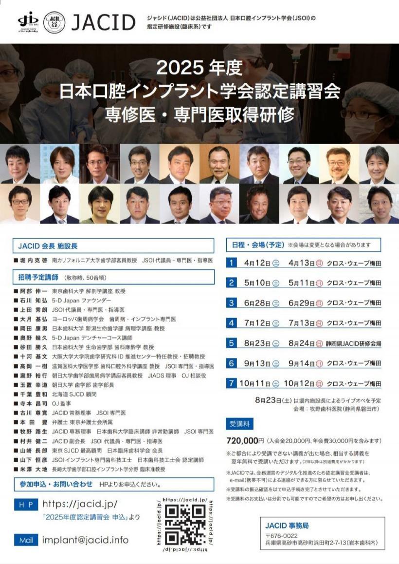JACID2026年度日本口腔インプラント学会認定講習会専修医・専門医取得研修│歯科関係者向けセミナー・勉強会案内(詳細ページ)│京都 四条烏丸の歯医者 インプラント・歯周病・義歯・審美歯科の村井歯科医院